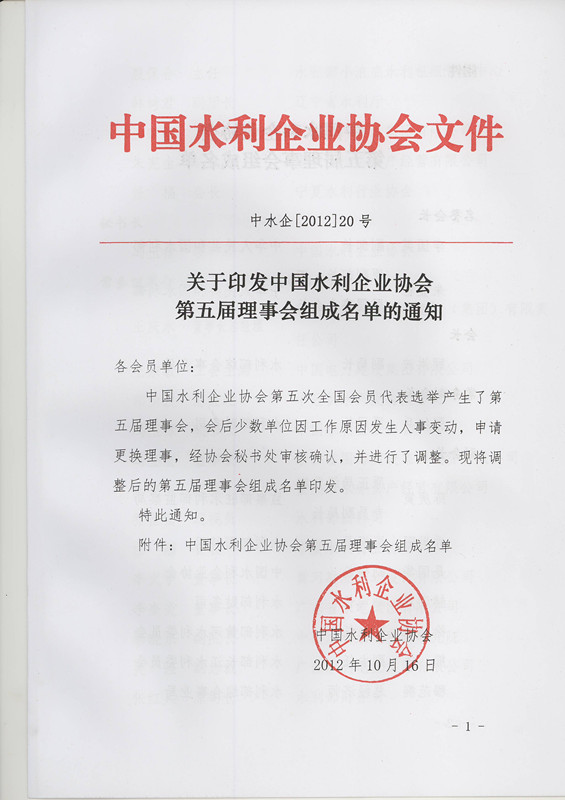 关于印发中国水利企业协会第五届理事会组成名单的通知