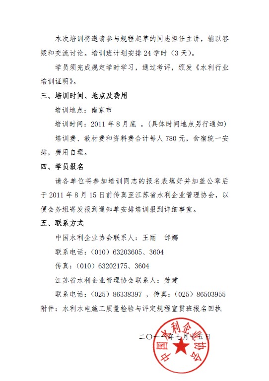 关于举办水利水电施工质量检验与评定规程宣贯班的预通知