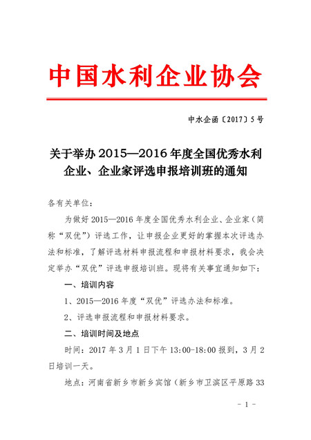 关于举办2015-2016年度全国优秀水利企业、企业家评选申报培训班的通知