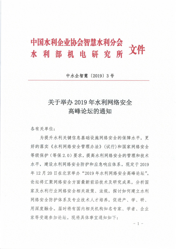关于举办2019年水利网络安全高峰论坛的通知