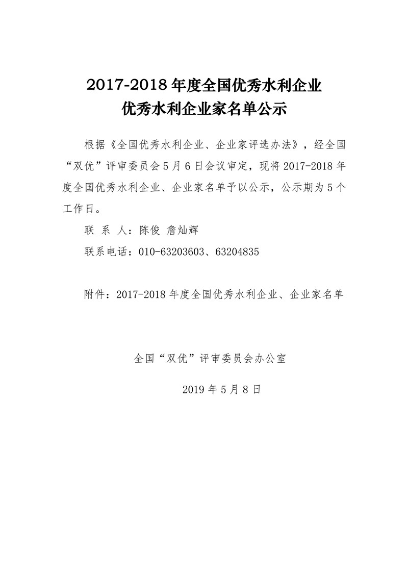 2017-2018年度全国优秀水利企业、优秀水利企业家名单公示
