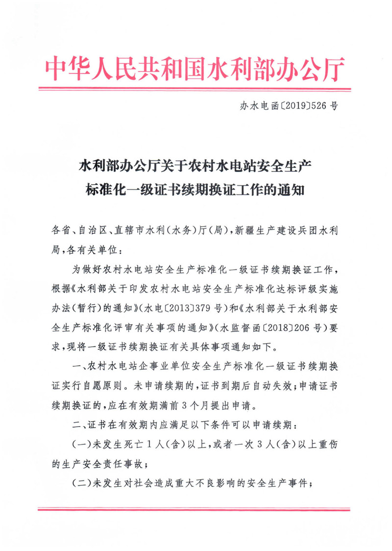 水利部办公厅关于农村水电站安全生产标准化一级证书续期换证工作的通知