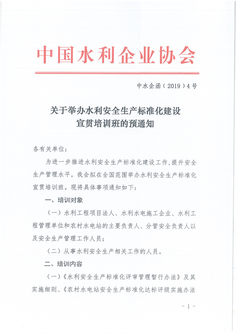关于举办水利安全生产标准化建设宣贯培训班的预通知