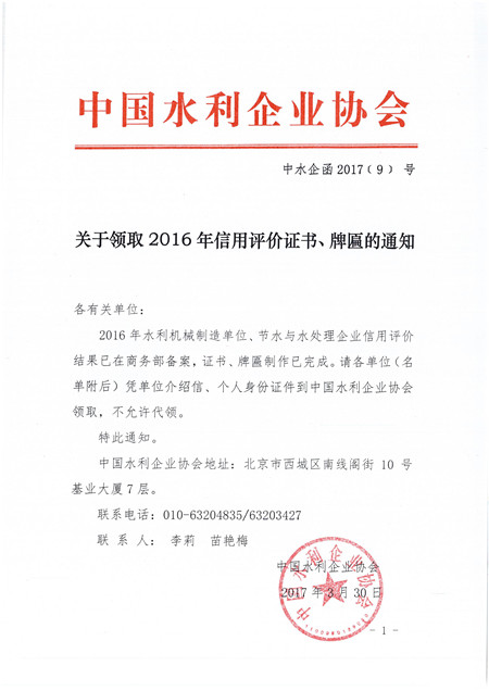 关于领取2016年信用评价证书、牌匾的通知