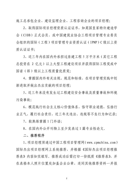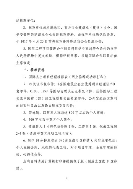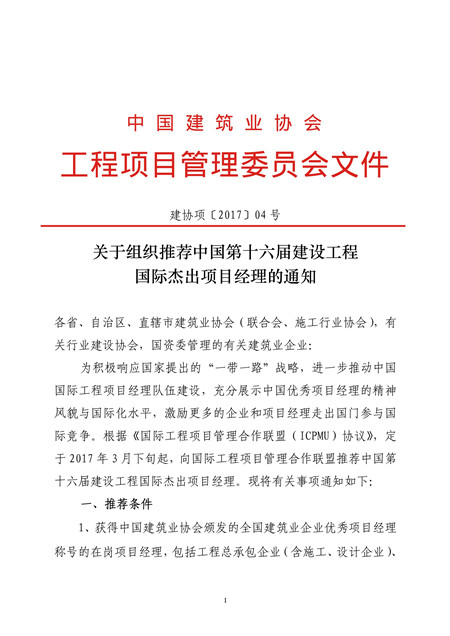 现将中国建筑业协会工程项目管理委员会文件《关于组织推荐中国第十六届建设工程国际杰出项目经理的通知》转发,有意申报的单位请与中国水利企业协会联系。 联系人:刘志萍 陈俊,电话:63202185 63203603