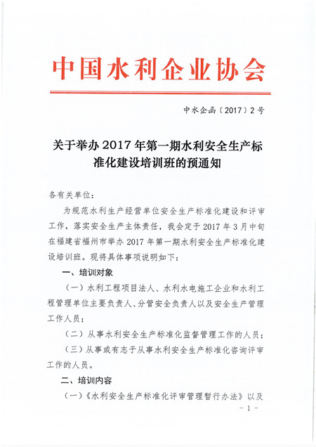 关于举办2017年第一期水利安全生产标准化建设培训班的预通知