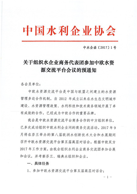 关于组织水企业商务代表团参加中欧水资源交流平台会议的预通知