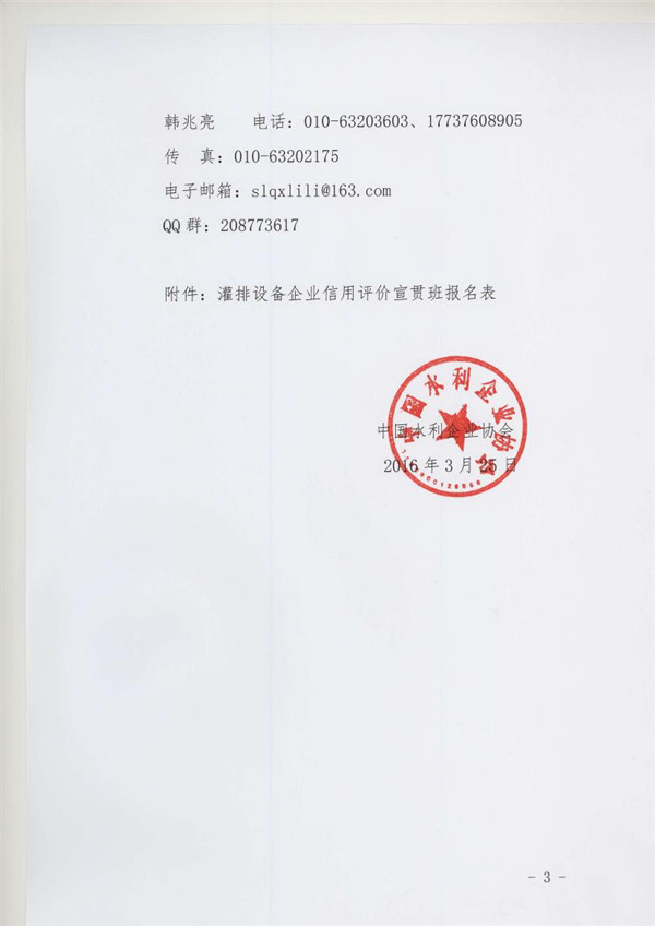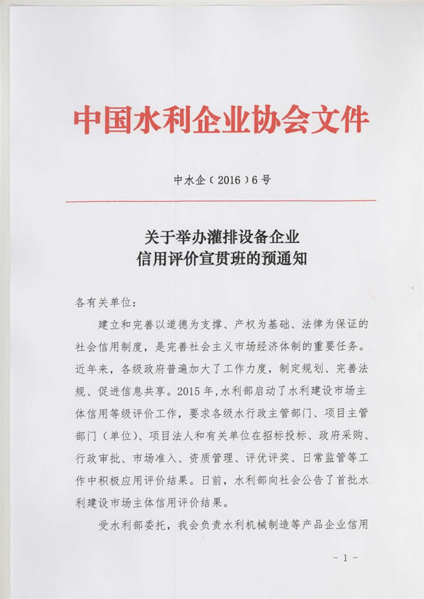 关于举办灌排设备企业信用评价宣贯班的预通知