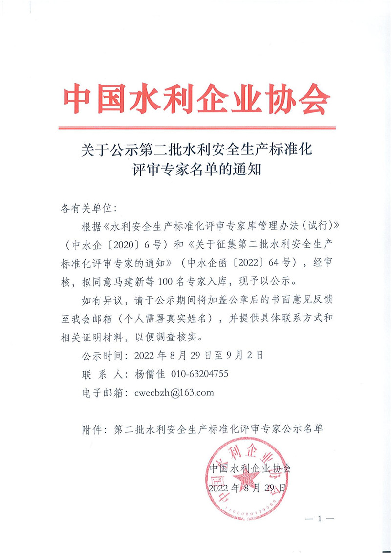关于公示第二批水利安全生产标准化评审专家名单的通知