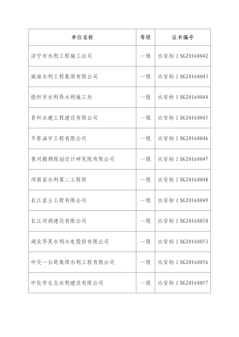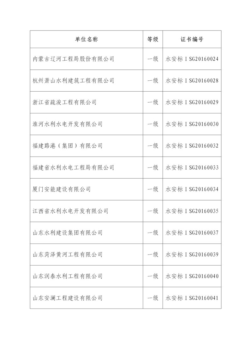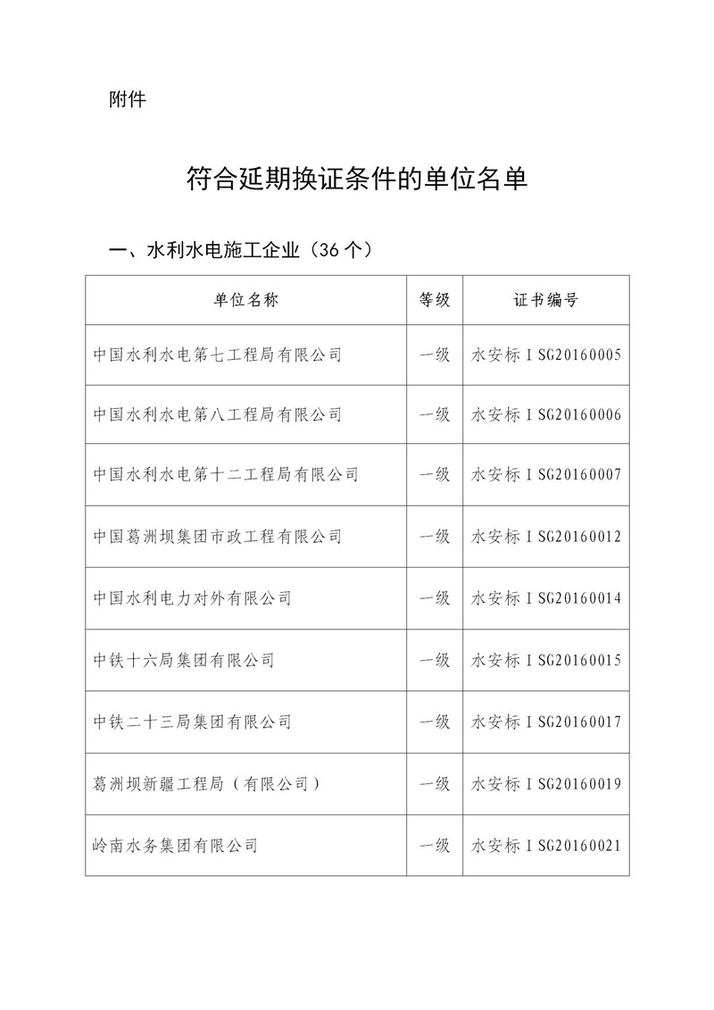 根据《水利部关于印发<水利安全生产标准化评审管理暂行办法>的通知》(水安监〔2013〕189号)、《水利部关于水利部安全生产标准化评审有关事项的通知》(水监督函〔2018〕206号)和《水利部办公厅关于水利安全生产标准化等级证书延期换证工作的通知》(办安监函〔2018〕49号),经中国水利企业协会审核,拟对水利安全生产标准化一级证书有效期满、符合延期条件的中国水利水电第七工程局有限公司等41家单位(详见附件)予以公告,并换发水利安全生产标准化等级证书。现予以公示。