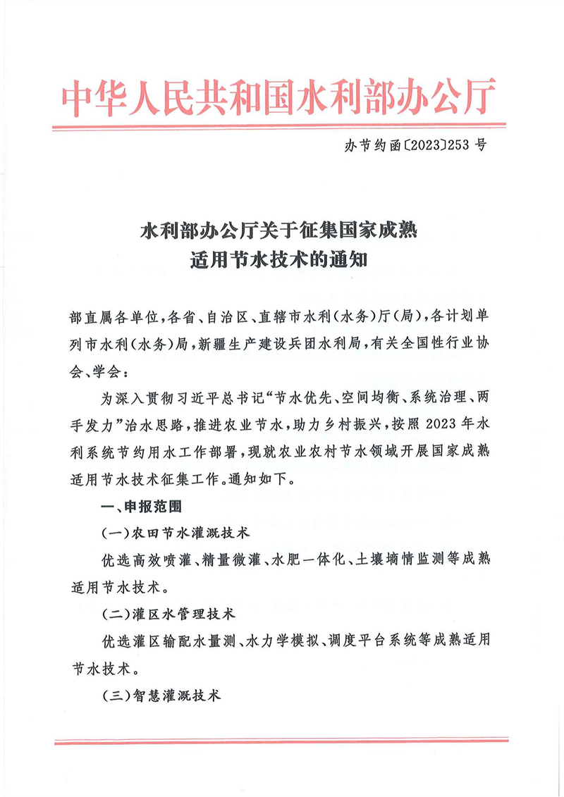 水利部办公厅关于征集国家成熟适用节水技术的通知(办节约函〔2023〕253 号).pdf