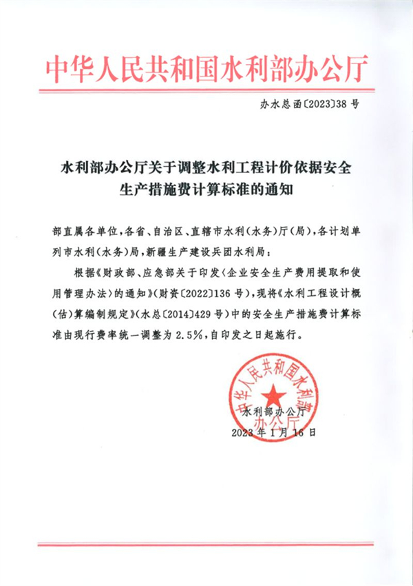 根据《财政部、应急部关于印发〈企业安全生产费用提取和使用管理办法〉的通知》(财资〔2022〕136号),现将《水利工程设计概(估)算编制规定》(水总〔2014〕429号)中的安全生产措施费计算标准由现行费率统一调整为2.5%,自印发之日起施行。