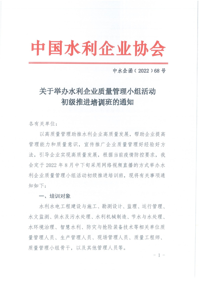 关于举办水利企业质量管理小组活动初级推进培训班的通知