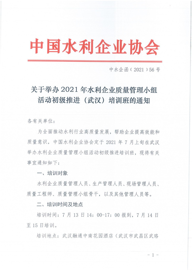 关于举办2021年水利企业质量管理小组活动初级推进(武汉)培训班的通知