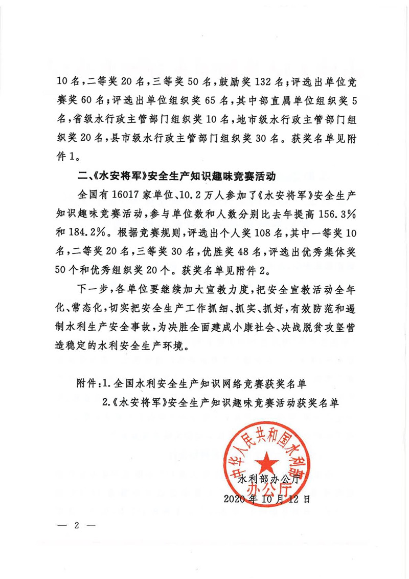 水利部办公厅关于公布2020年全国水利安全生产知识网络竞赛和《水安将军》安全生产知识趣味竞赛活动获奖名单的通知
