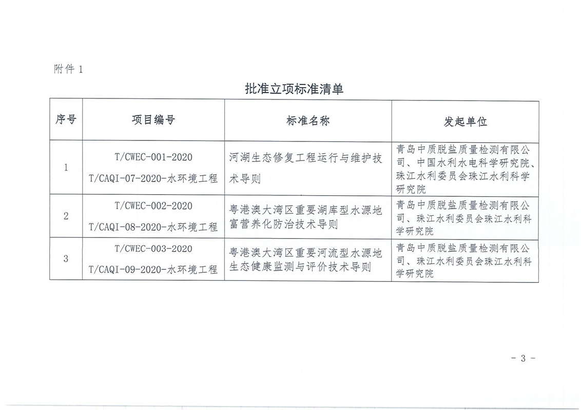 关于批准《河湖生态修复工程运行与维护技术导则》等3项标准立项的通知