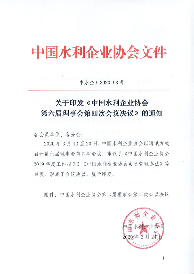关于印发《中国水利企业协会第六届理事会第四次会议决议》的通知