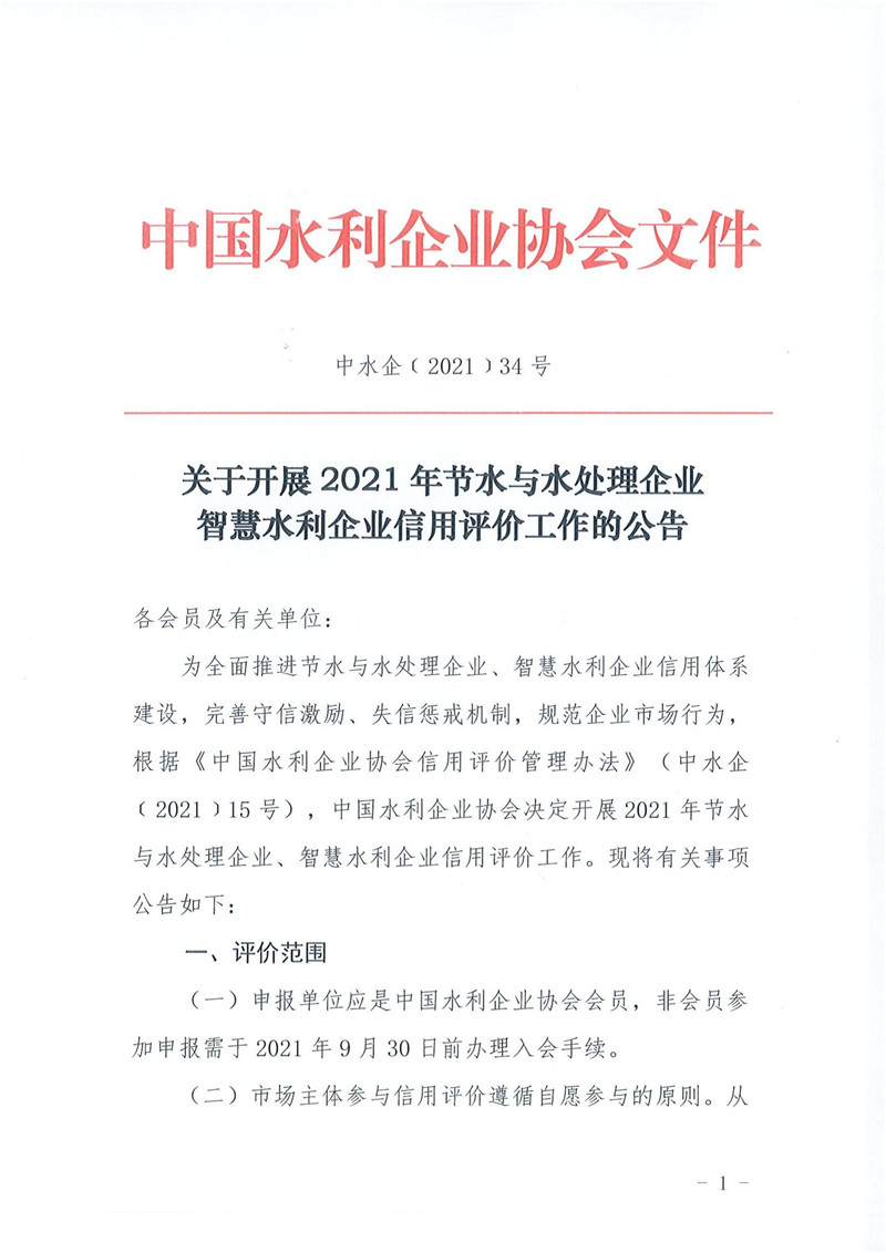关于开展2021年节水与水处理企业、智慧水利企业信用评价工作的公告.pdf