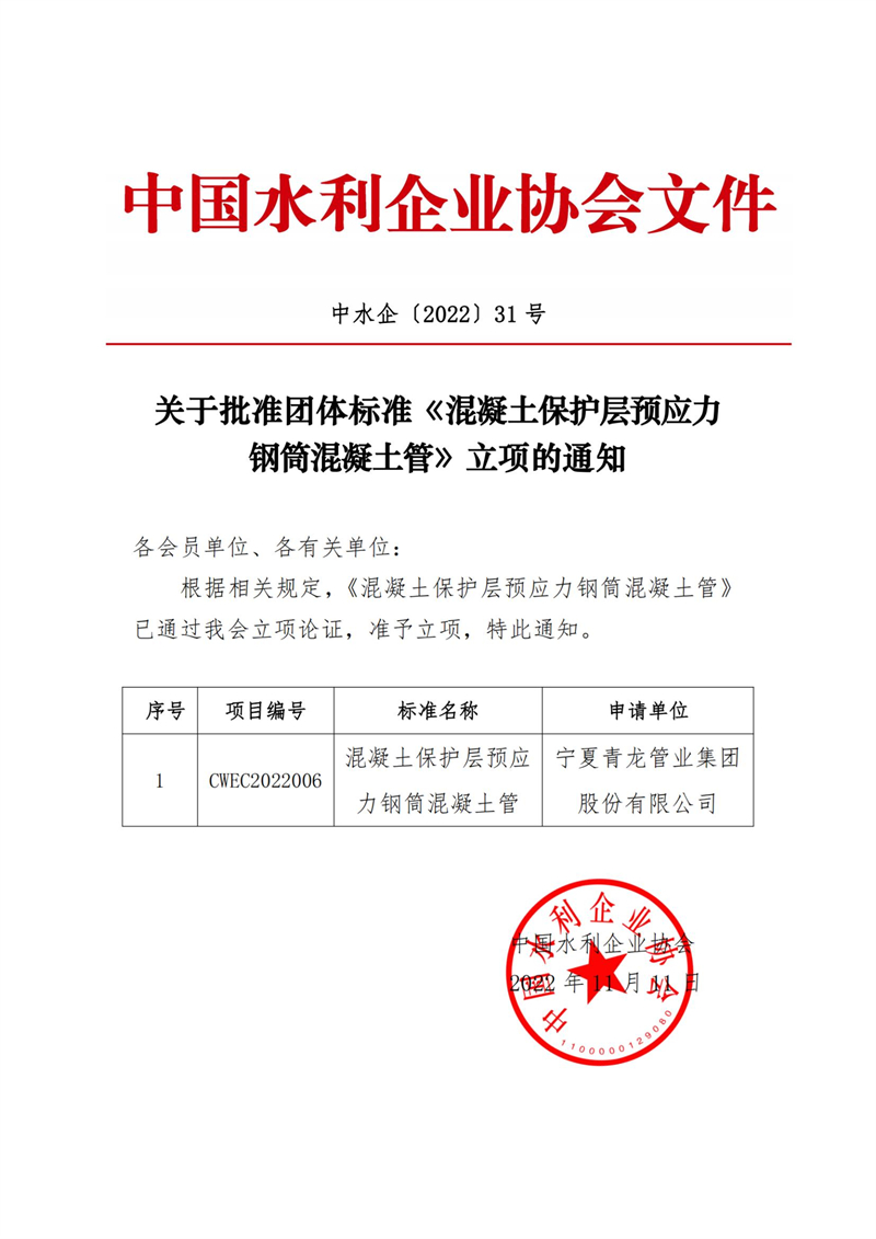 关于批准团体标准《混凝土保护层预应力钢筒混凝土管》立项的通知