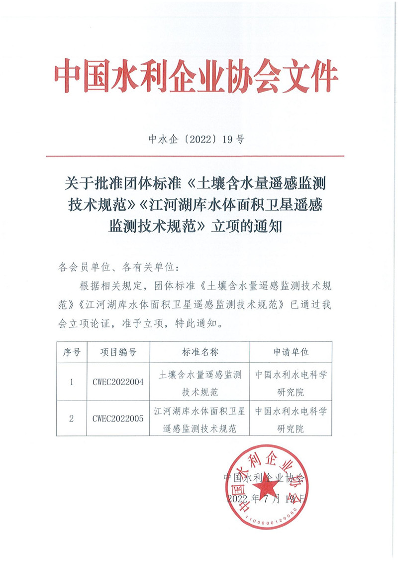 关于批准团体标准《土壤含水量遥感监测技术规范》《江河湖库水体面积卫星遥感监测技术规范》立项的通知
