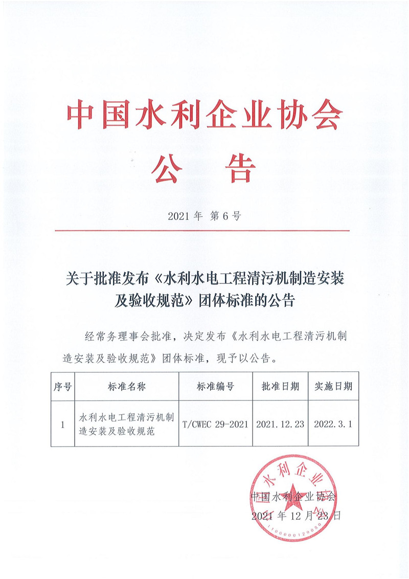 关于批准发布《水利水电工程清污机制造安装及验收规范》团体标准的公告