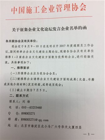 转发中国施工企业管理协会“关于征集企业文化论坛发言企业名单的函”