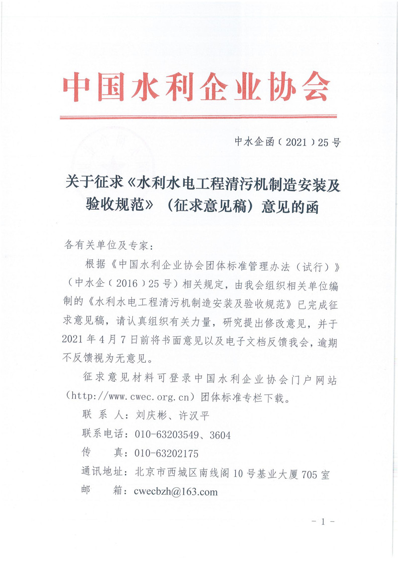 关于征求《水利水电工程清污机制造安装及验收规范》(征求意见稿)意见的函