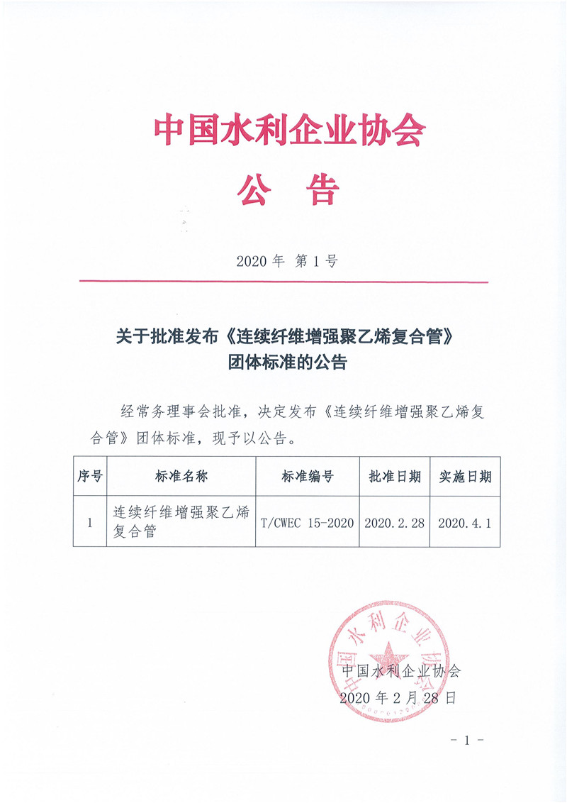 关于批准发布《连续纤维增强聚乙烯复合管》团体标准的公告