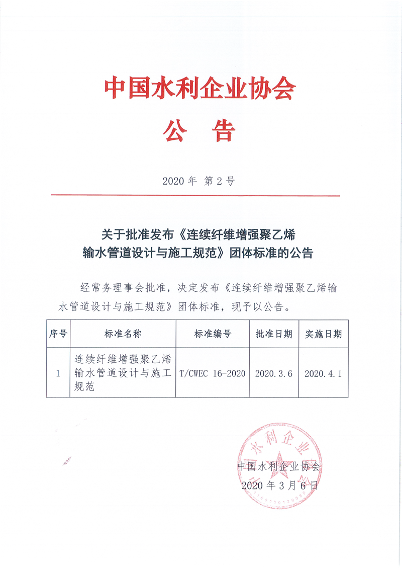 关于批准发布《连续纤维增强聚乙烯输水管道设计与施工规划》团体标准的公告