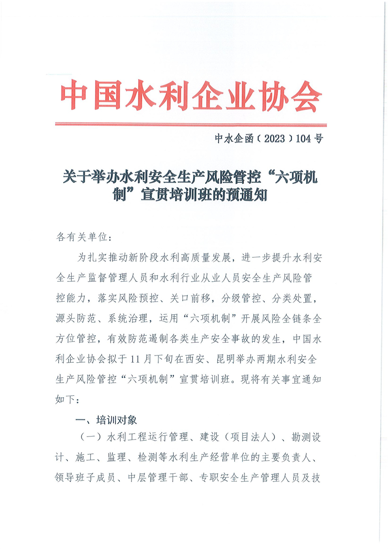 关于举办水利安全生产风险管控“六项机制”宣贯培训班的预通知