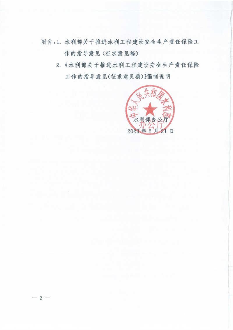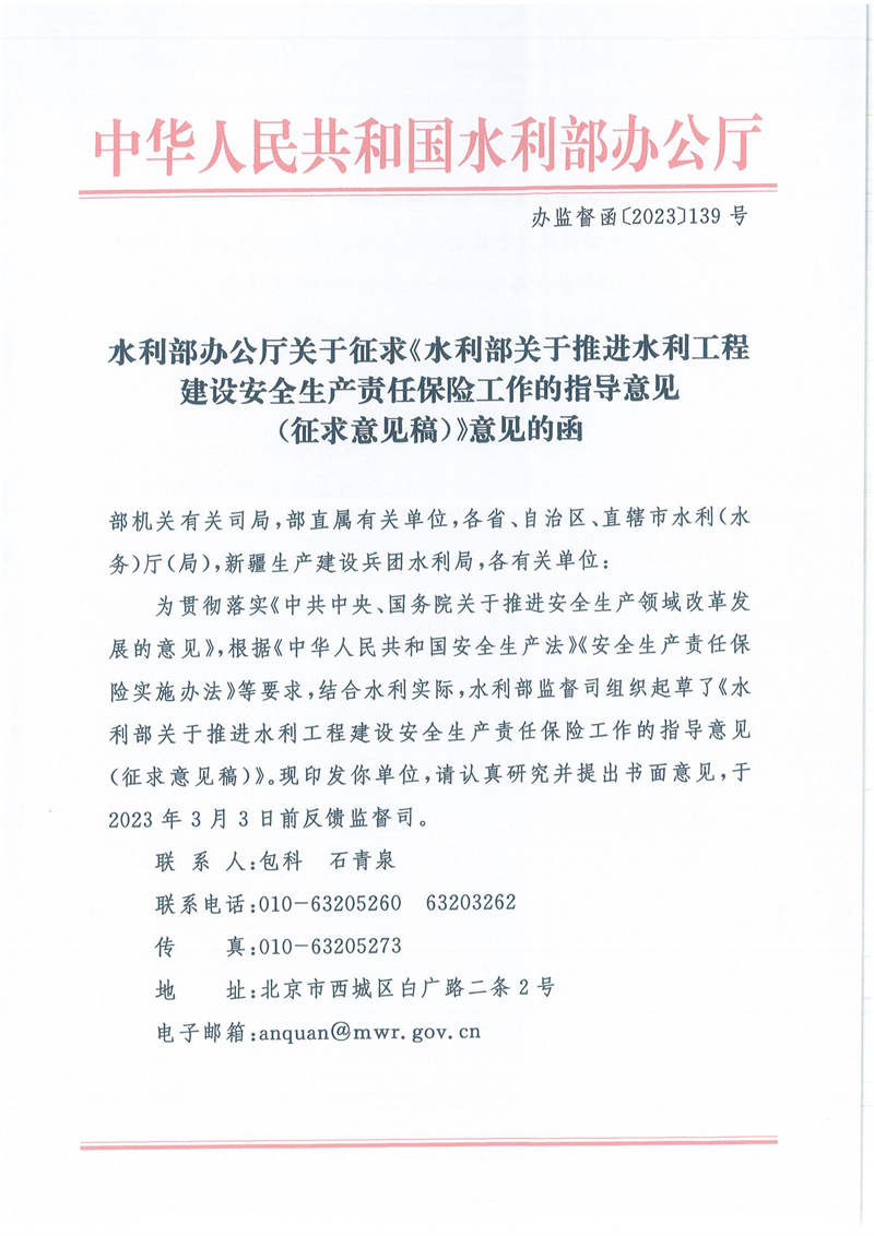 为贯彻落实《中共中央、国务院关于推进安全生产领域改革发展的意见》,根据《中华人民共和国安全生产法》《安全生产责任保险实施办法》等要求,结合水利实际,水利部监督司组织起草了《水利部关于推进水利工程建设安全生产责任保险工作的指导意见(征求意见稿)》。现印发你单位,请认真研究并提出书面意见,于2023年3月3日前反馈监督司。