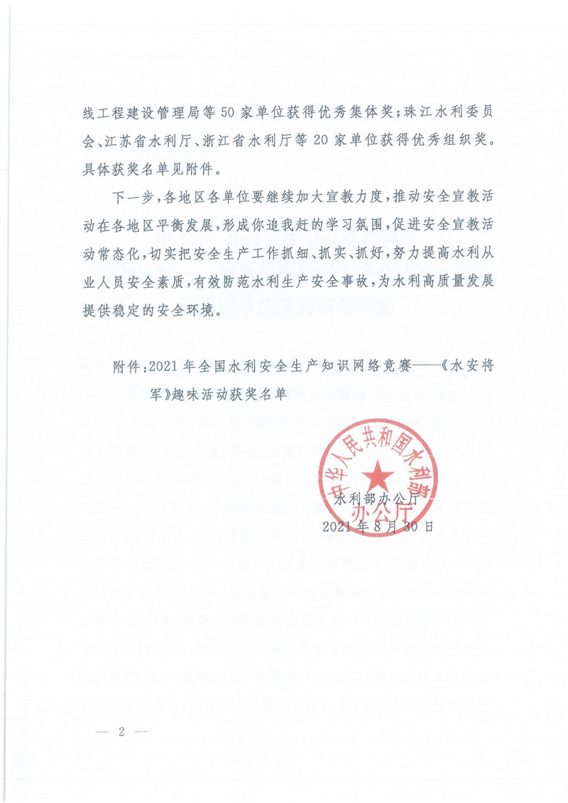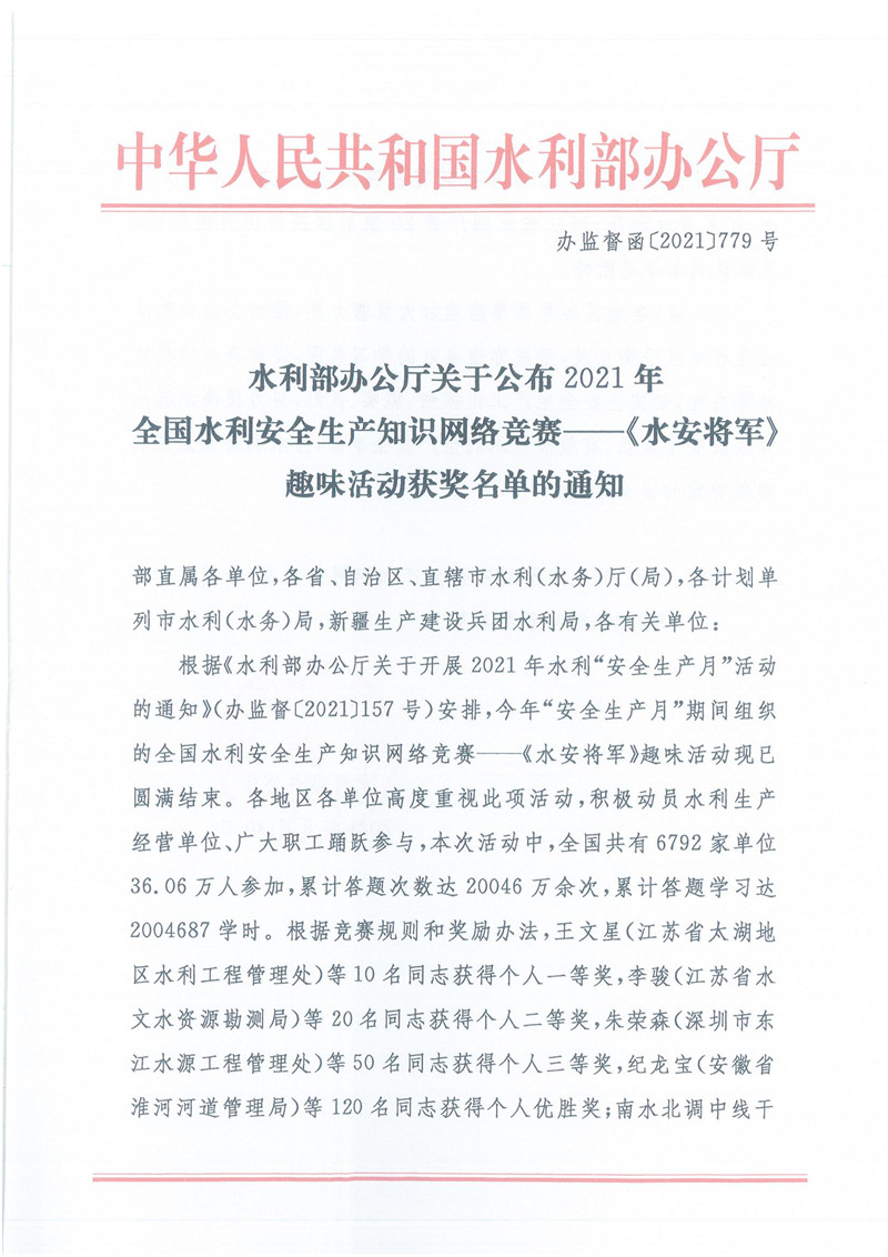 水利部办公厅关于公布2021年全国水利安全生产知识网络竞赛——《水安将军》趣味活动获奖名单的通知(办监督函[2021]779号)(1).pdf
