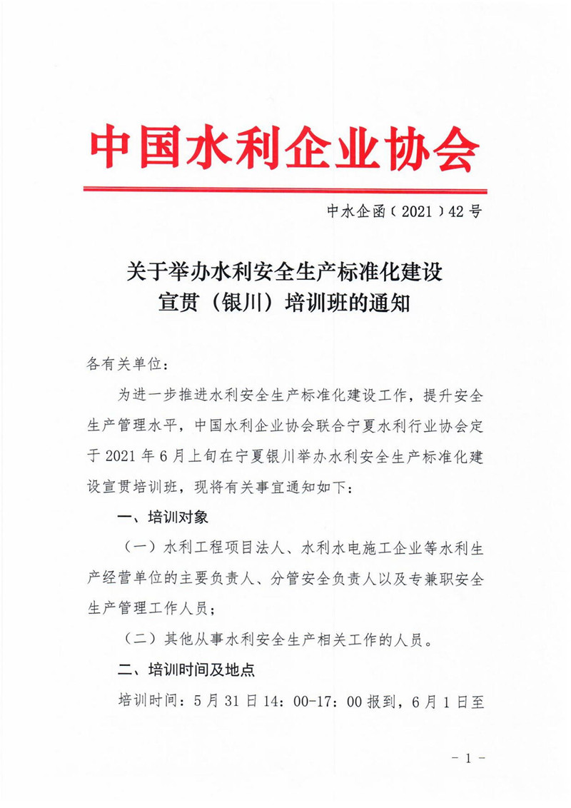 关于举办水利安全生产标准化建设宣贯(银川)培训班的通知