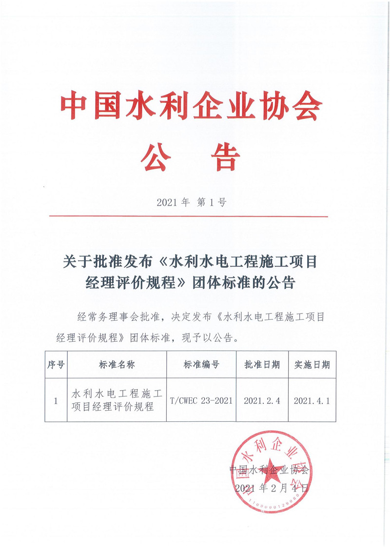 关于批准发布《水利水电工程施工项目经理评价规程》团体标准的公告(2021年第1号).pdf