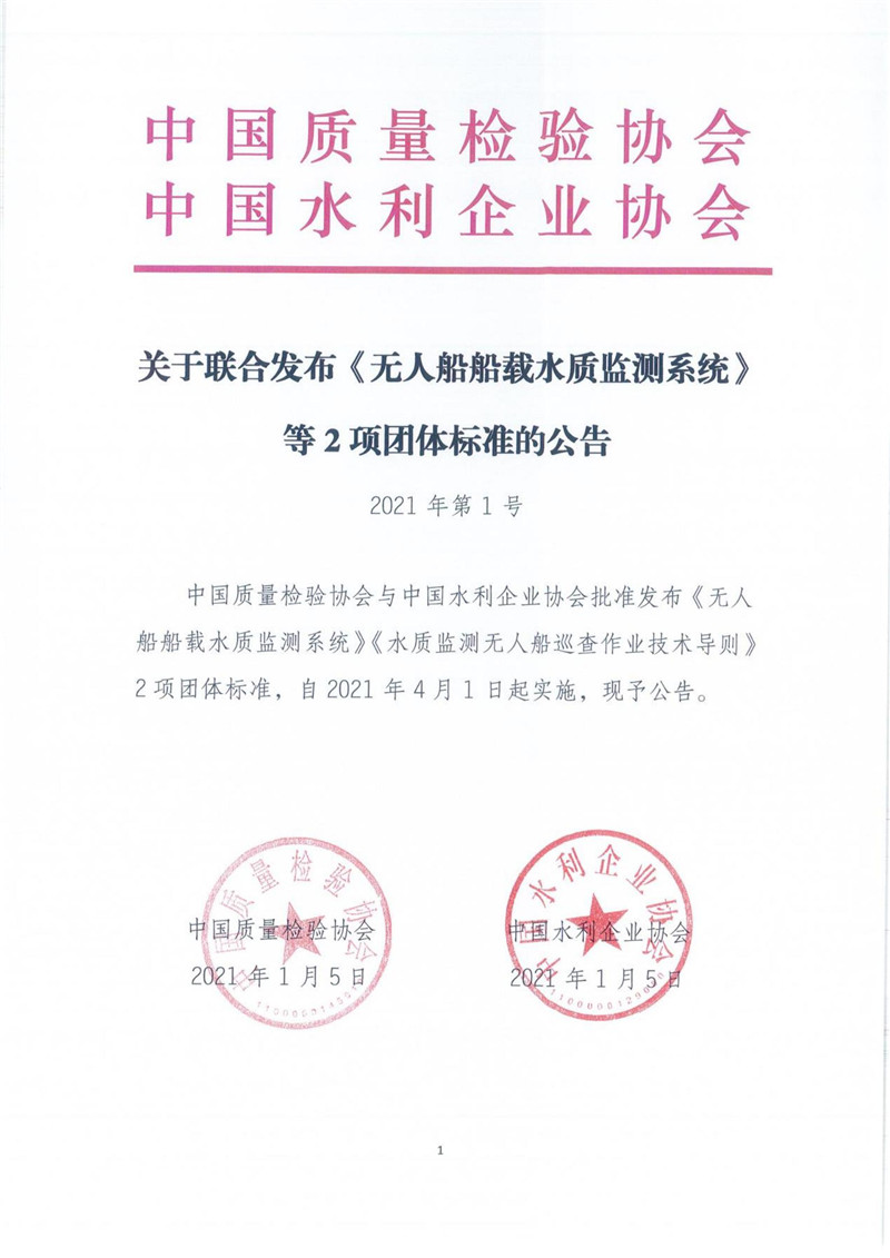 中国水利企业协会关于联合发布《无人船船载水质监测系统》等2团体标准的公告