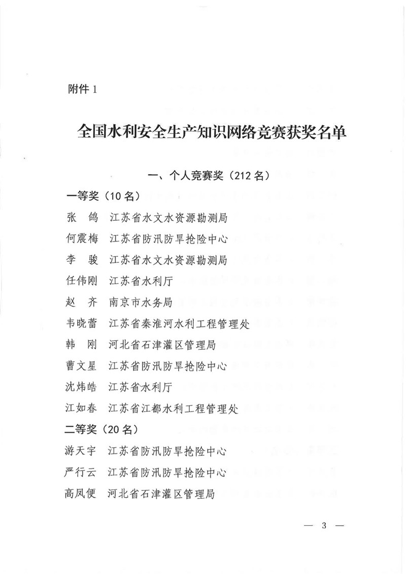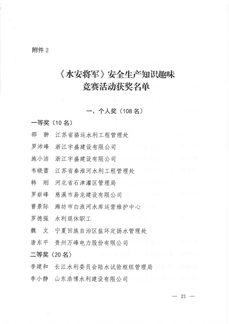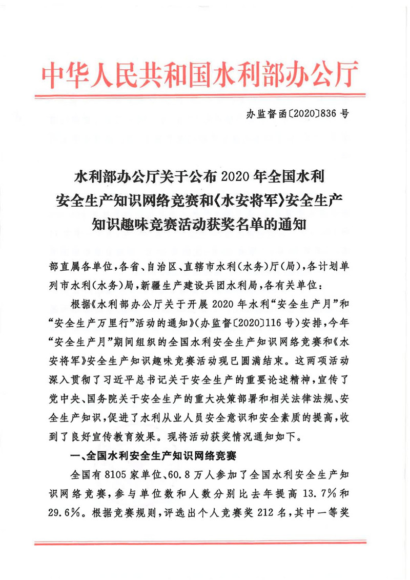 水利部办公厅关于公布2020年全国水利安全生产知识网络竞赛和《水安将军》安全生产知识趣味竞赛活动获奖名单的通知