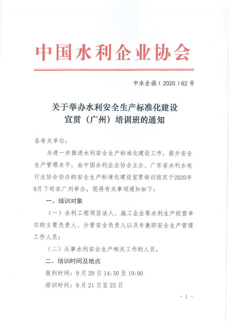 关于举办水利安全生产标准化建设宣贯(广州)培训班的通知