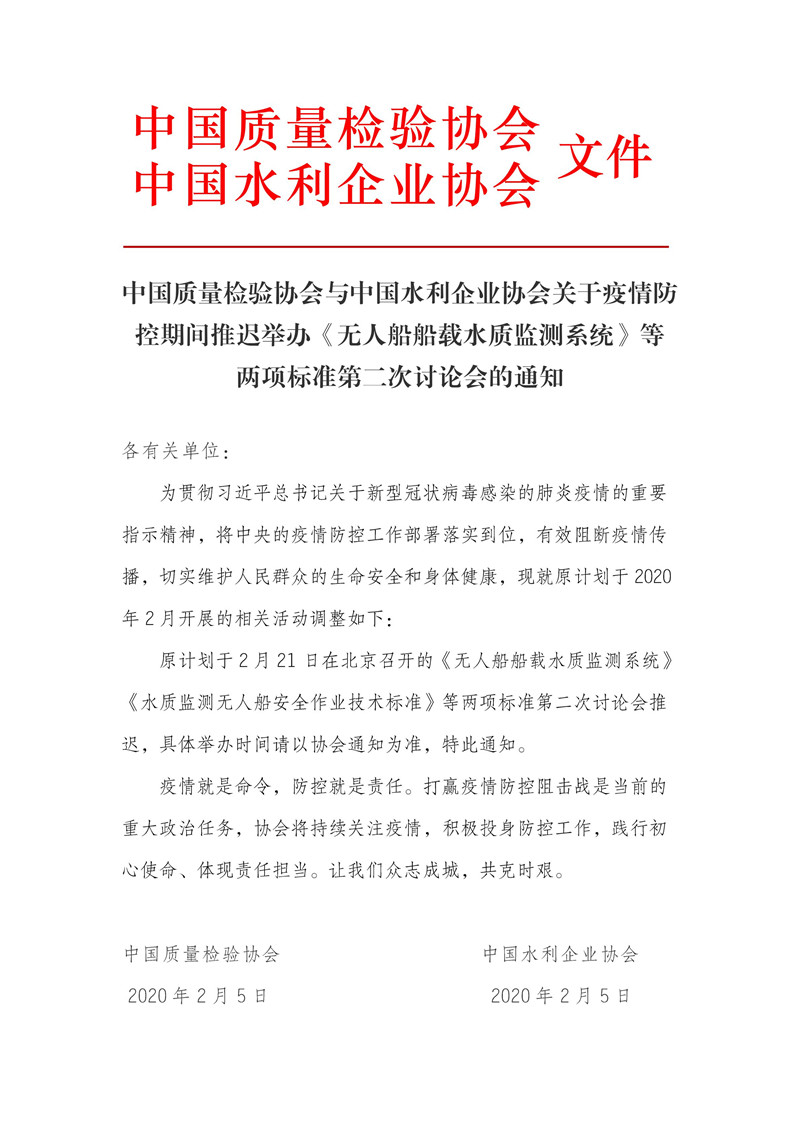 中国质量检验协会与中国水利企业协会关于疫情防控期间推迟举办《无人船舶载水质检测系统》等两项标准第二次讨论会的通知
