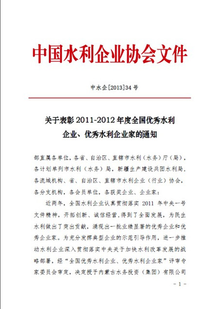 关于表彰2011-2012年度全国优秀水利企业、优秀水利企业家的通知