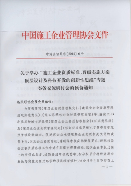 关于举办 “施工企业资质标准、晋级实施方案顶层设计及科技开发的创新性思维”专题实务交流研讨会的预备通知