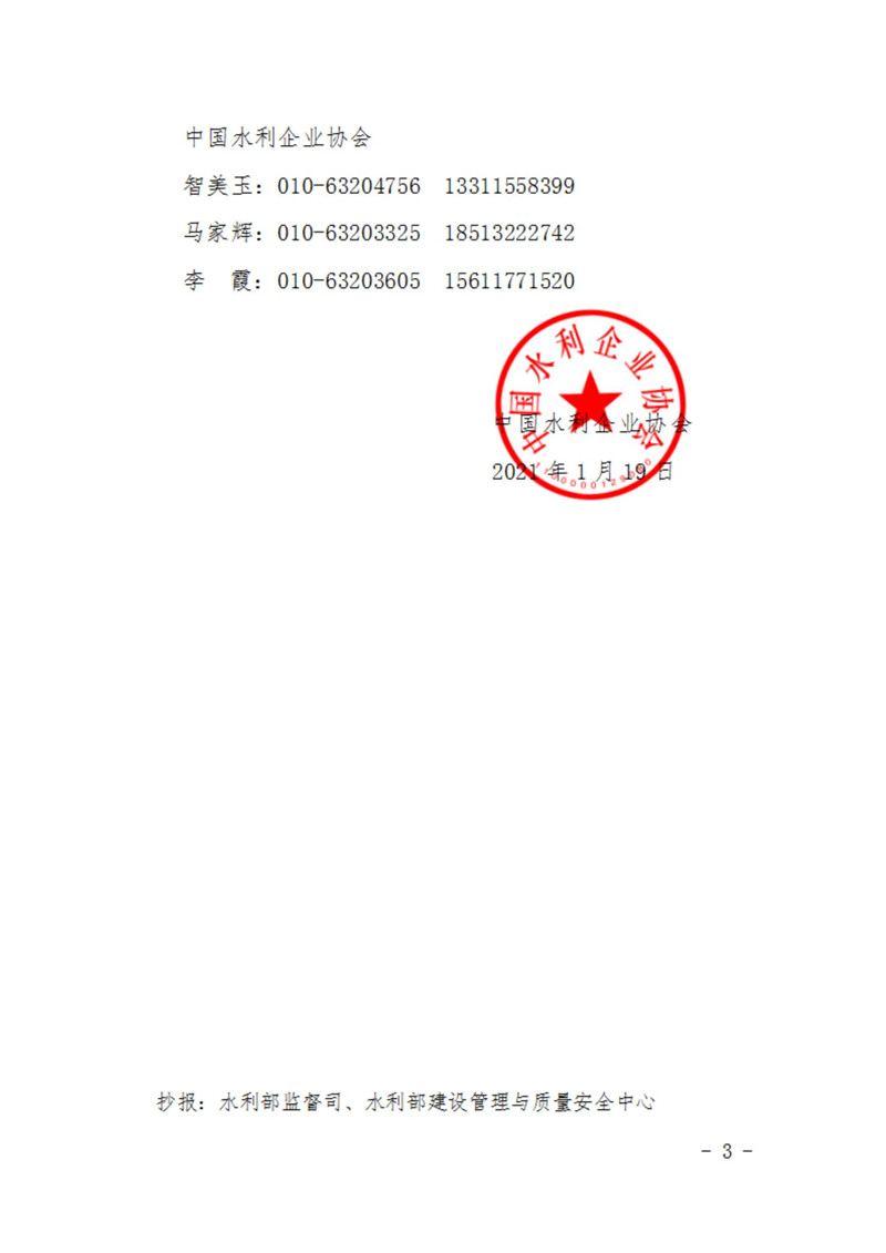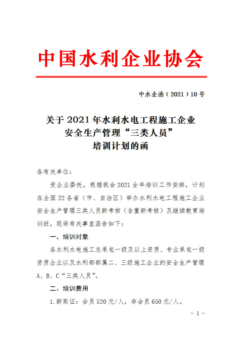 关于2021年水利水电工程施工企业安全生产管理三类人员培训计划的函