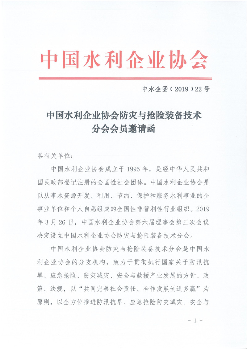 中国水利企业协会防灾与抢险装备技术分会会员邀请函