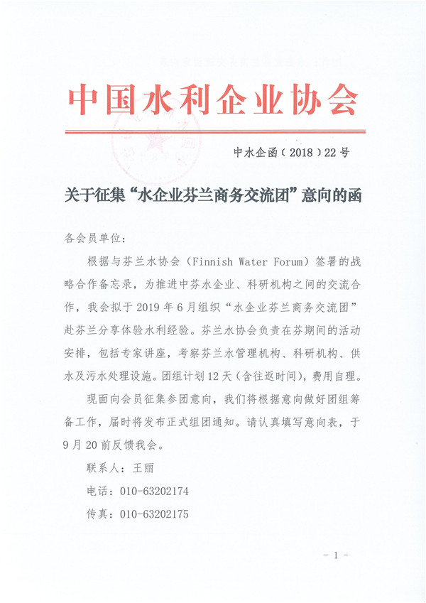 关于征集“水企业芬兰商务交流团”意向的函