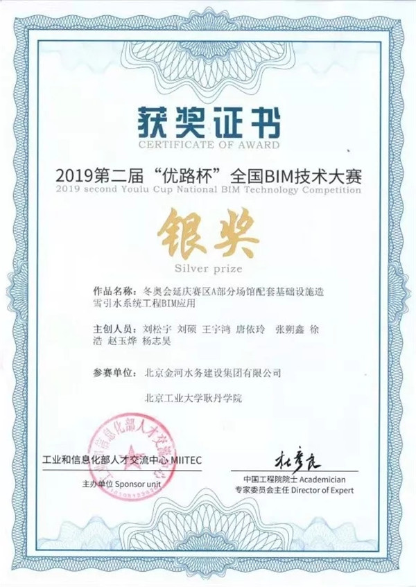 2019年12月9日,第二届“优路杯”全国BIM技术大赛颁奖典礼在京举行。北京金河水务建设集团有限公司冬奥会延庆赛区造雪引水系统工程项目BIM成果和南水北调配套工程河西支线1标泵站项目BIM成果分别获得第二届“优路杯”BIM技术大赛银奖和优秀奖。这是北京金河水务建设集团有限公司在BIM技术领域迈出的重要一步。