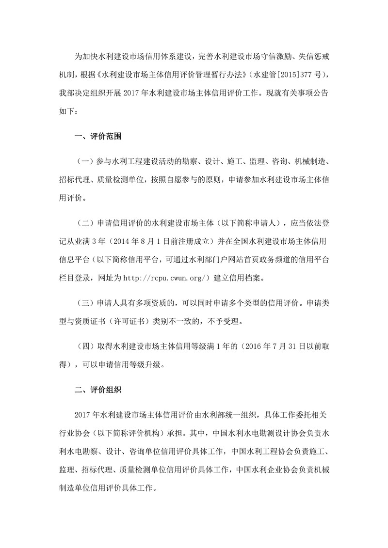 水利部关于开展2017年水利建设市场主体信用评价工作的公告